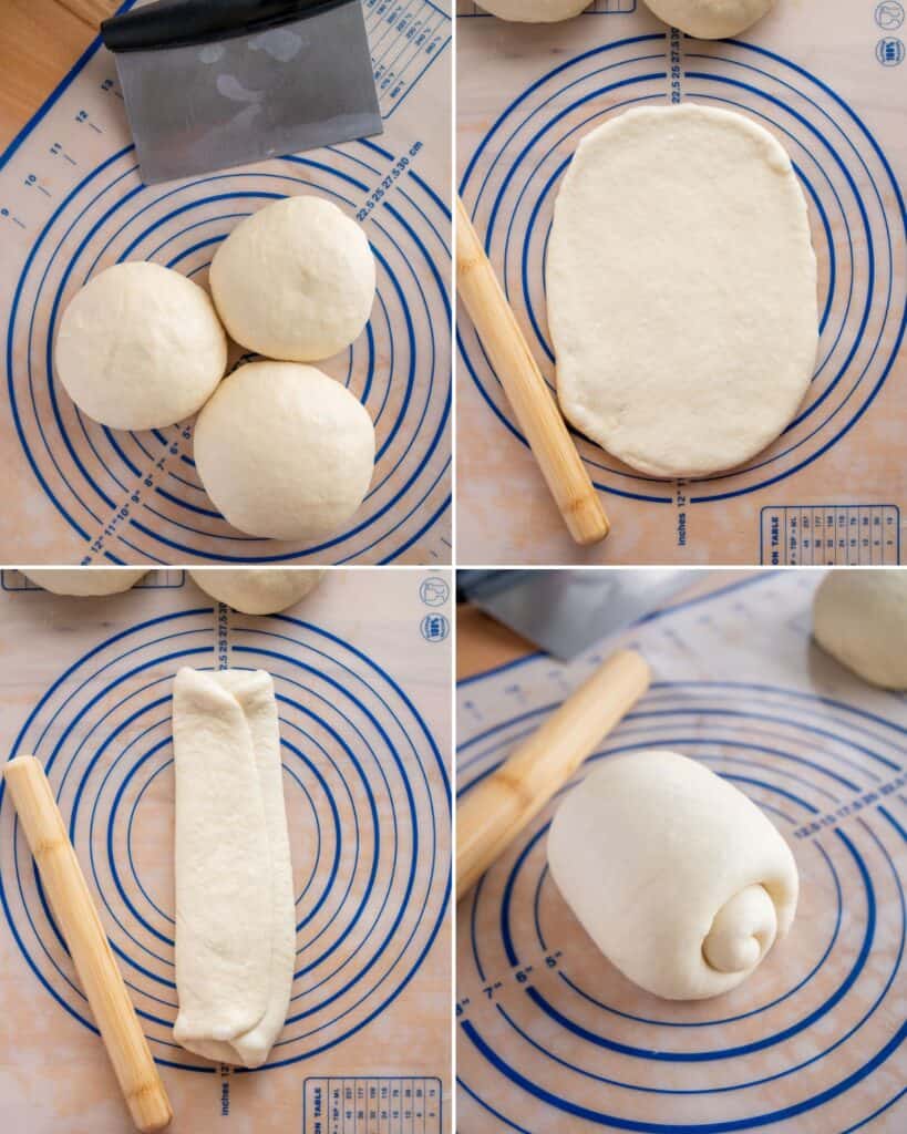 - Shape the rolls: Shape each piece of dough into a ball. (It doesn't need to be precise.) Roll the dough out into an oval, then fold the long sides over one another like a letter. Then roll from the short end so each piece is a compact log. (For more clarity, you can check out the Visual Guide in the blog post — the shaping section.)Alternatively, you can simply shape each roll into a ball. You can do so by tucking the edges of the dough under itself to form a rough ball. Pinch the seams together on the bottom, then place the dough seam-side down on the table. Cup your hand over the dough and roll it in small circles to create tension and smooth out the surface.