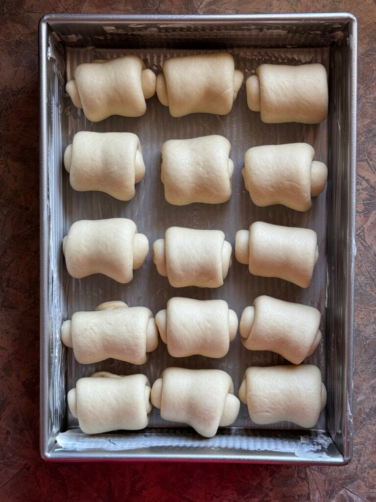 Whichever shape you choose, arrange the rolls in a greased or buttered 9×13″ baking pan. Alternatively, you can divide them between two 9″ round pans, or two 8″ square pans. Cover with a damp towel or plastic wrap and let the rolls rise until roughly doubled in size.