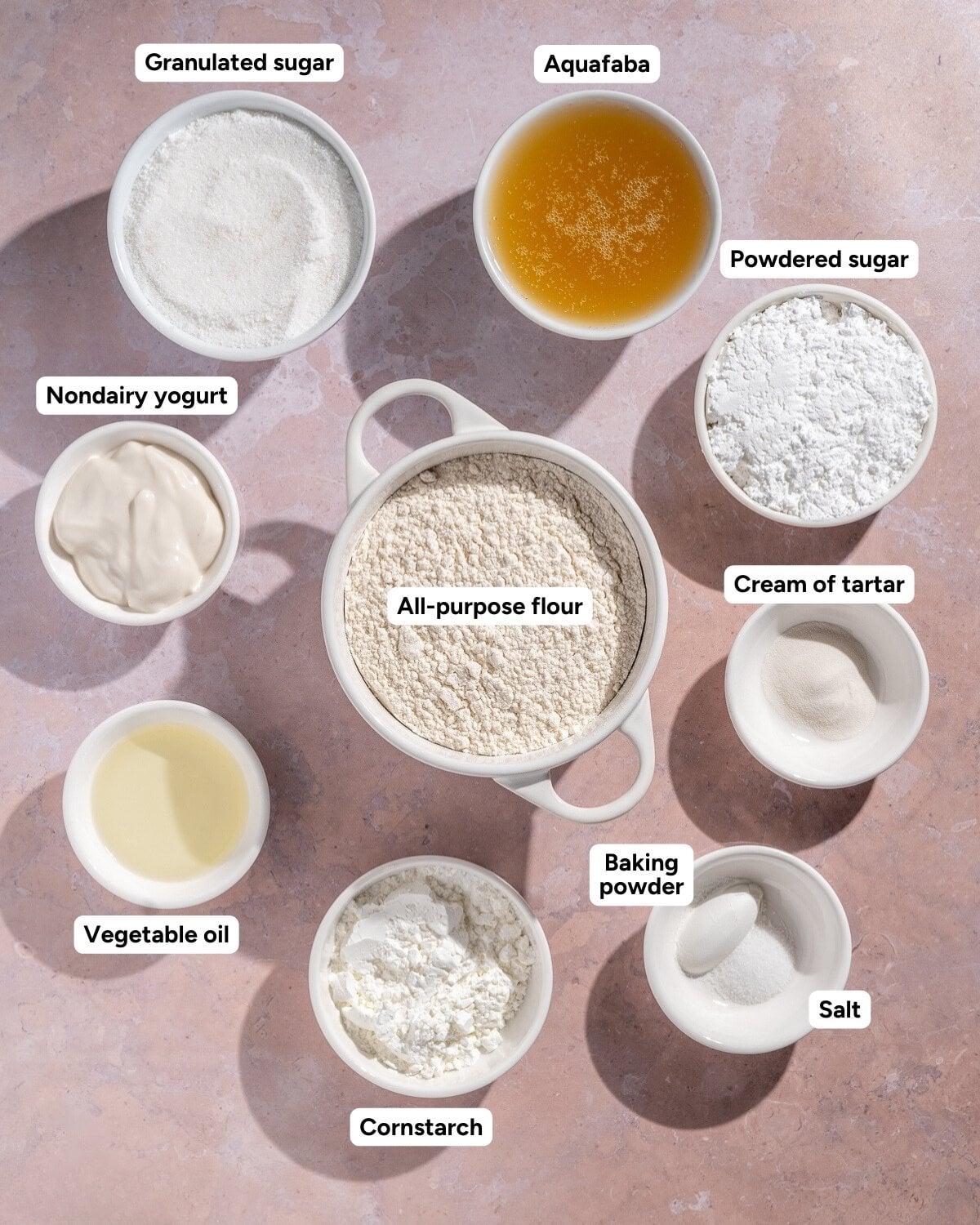 - Sift in the flour, baking powder, cornstarch, and salt. Gently fold the dry ingredients into the whipped aquafaba mixture until no streaks of dry flour are visible.1 ½ cups all-purpose flour, 2 tablespoons cornstarch, 1 teaspoon baking powder, 1/4 teaspoon fine salt