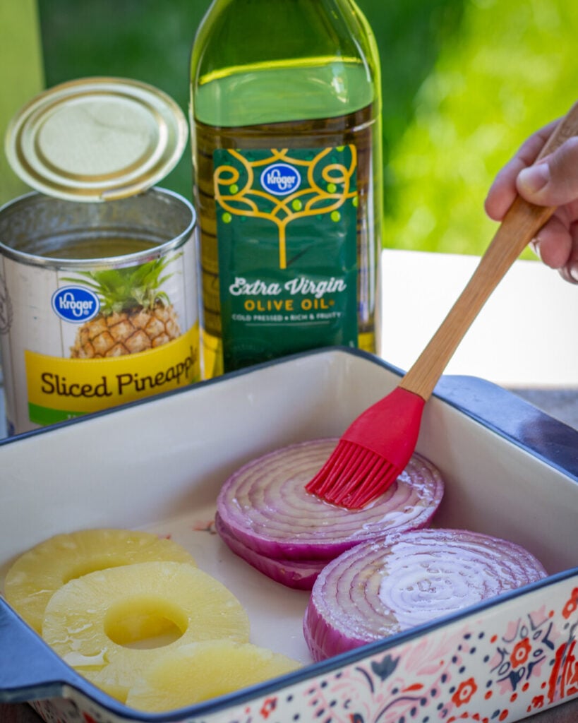 - When it comes time to grill, brush sliced onions and pineapple with olive oil. Place the onions on first, as they take the longest to cook. (They will require 8-10 minutes per side, until slightly charred.)