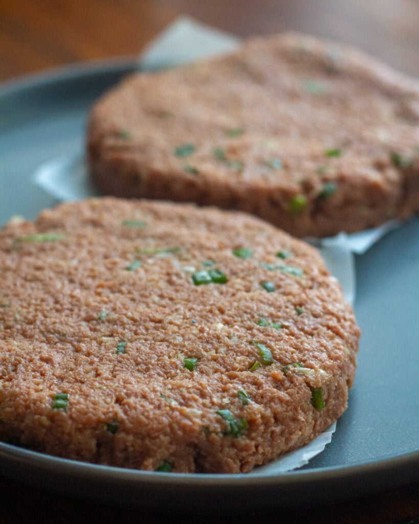 - Shape mixture into four patties about 3/4″ inch thick. Refrigerate for at least 20 minutes. This will allow the patties to firm up as the breadcrumbs absorb the liquid and bind everything together.